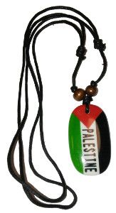 Adjustable-size necklace with black string and plastic pendant of the Palestine flag.