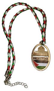 String with flag colors and a metallic pendant showing the Dome of the Rock and the Palestinian flag.